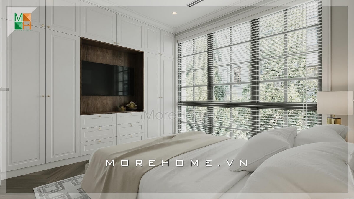 Thiết kế phòng ngủ nhà phố đẹp mắt, tất cả nội thất được làm từ chất liệu gỗ công nghiệp trẻ trung, không quá cầu kỳ mà vô cùng tiện nghi