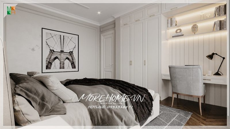 Mẫu thiết kế tủ quần áo 3 cánh kết hợp bàn học bằng gỗ tự nhiên sơn trắng sang trọng cho phòng ngủ chung cư, nhà phố, biệt thự đương đại